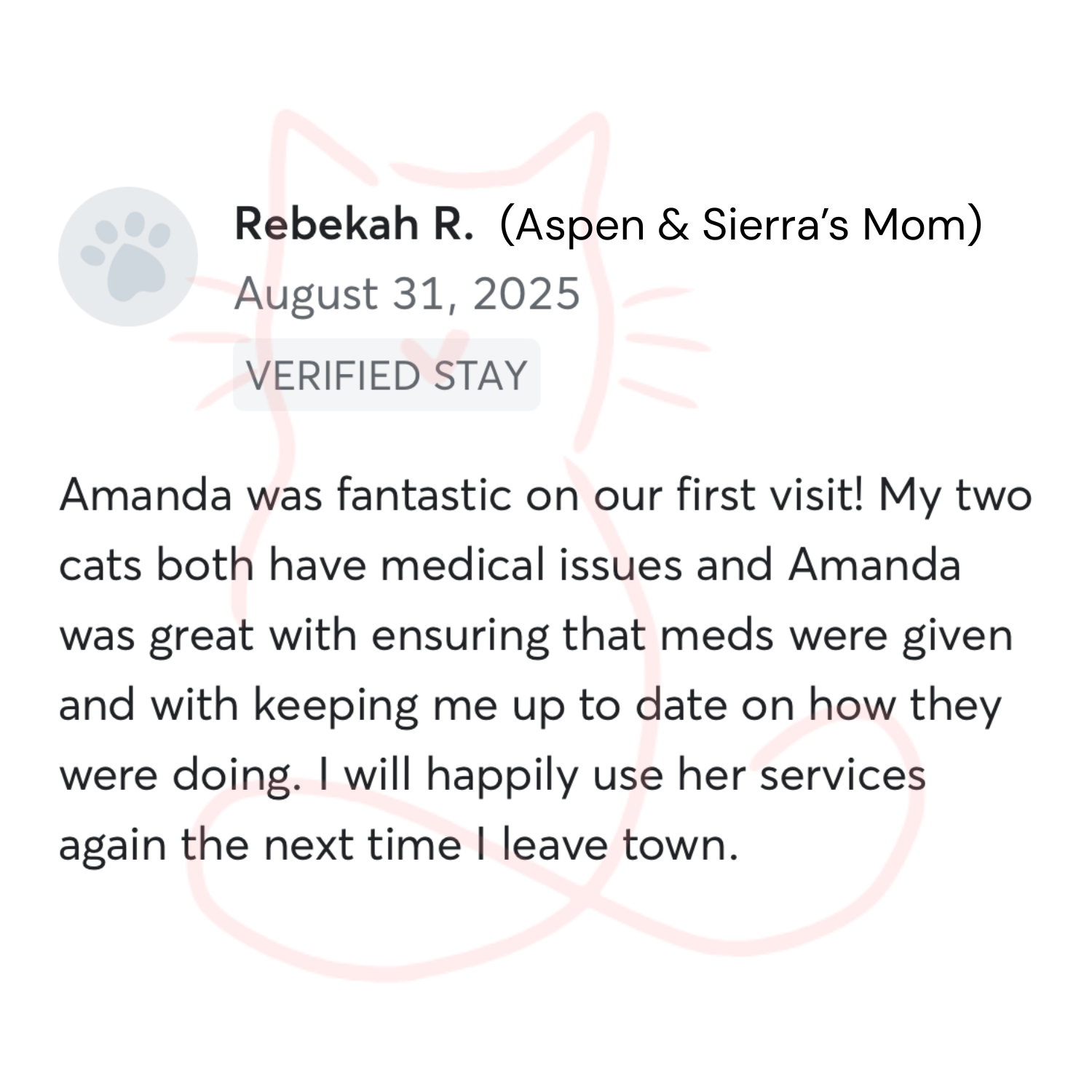 Founded by Amanda Hescock, a top-rated Reston cat sitter and cat mom of three with 16 years of experience. Specializing in anxious, senior, and high-needs cats with a proven knack for reading feline cues and personalizing care.